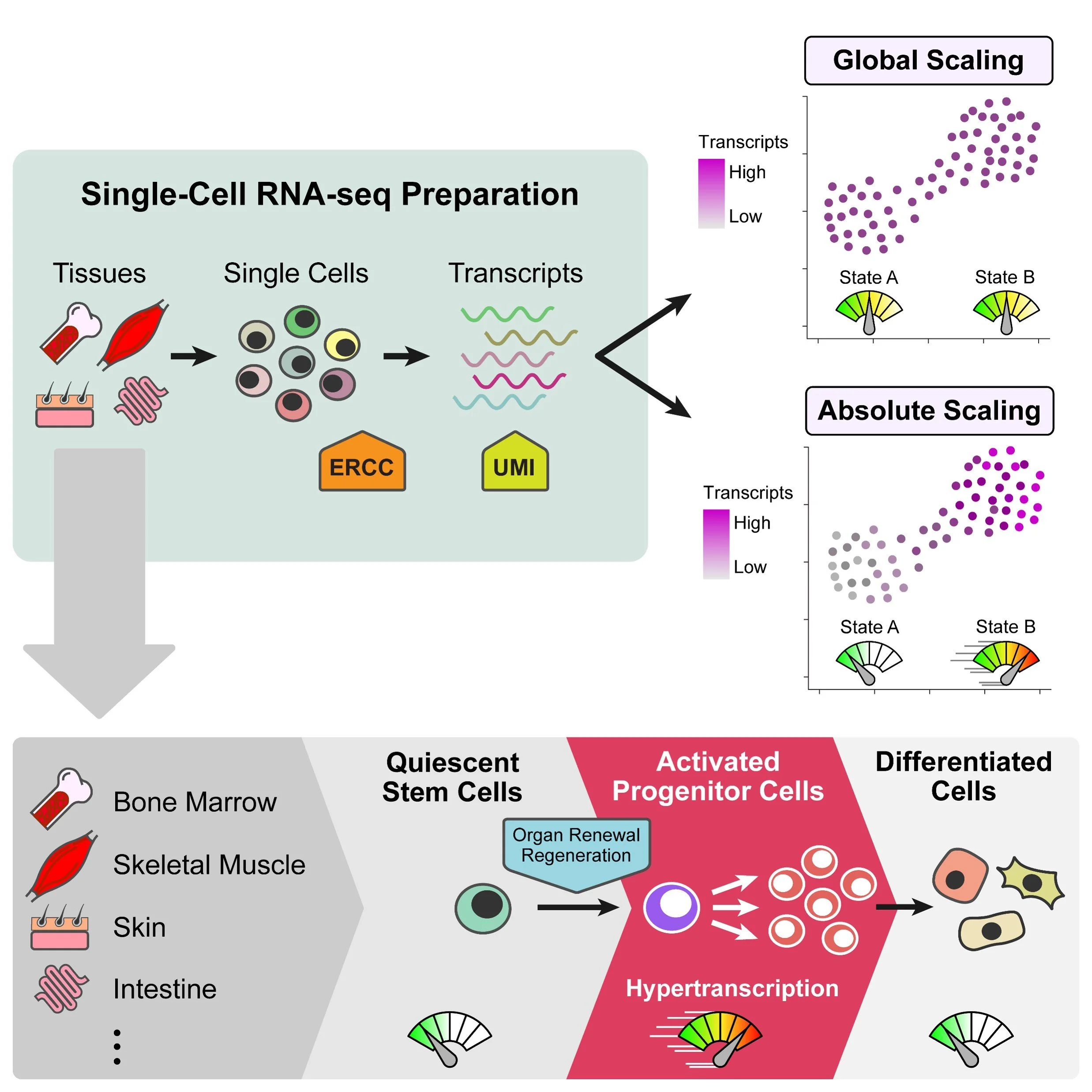 Abstract: Hypertranscription supports biosynthetically demanding cellular states through global transcriptome upregulation. Despite its potential widespread relevance, documented examples of hypertranscription remain few and limited to early development. Here, we demonstrate that absolute scaling of single-cell RNA-sequencing data enables the estimation of total transcript abundances per cell. We validate absolute scaling in known cases of developmental hypertranscription and apply it to adult cell types, revealing a remarkable dynamic range in transcriptional output. In adult organs, hypertranscription marks activated stem/progenitor cells with multilineage potential and is redeployed in conditions of tissue injury, where it precedes bursts of proliferation during regeneration. Our analyses identify a common set of molecular pathways associated with both adult and embryonic hypertranscription, including chromatin remodeling, DNA repair, ribosome biogenesis, and translation. These shared features across diverse cell contexts support hypertranscription as a general and dynamic cellular program that is pervasively employed during development, organ maintenance, and regeneration.